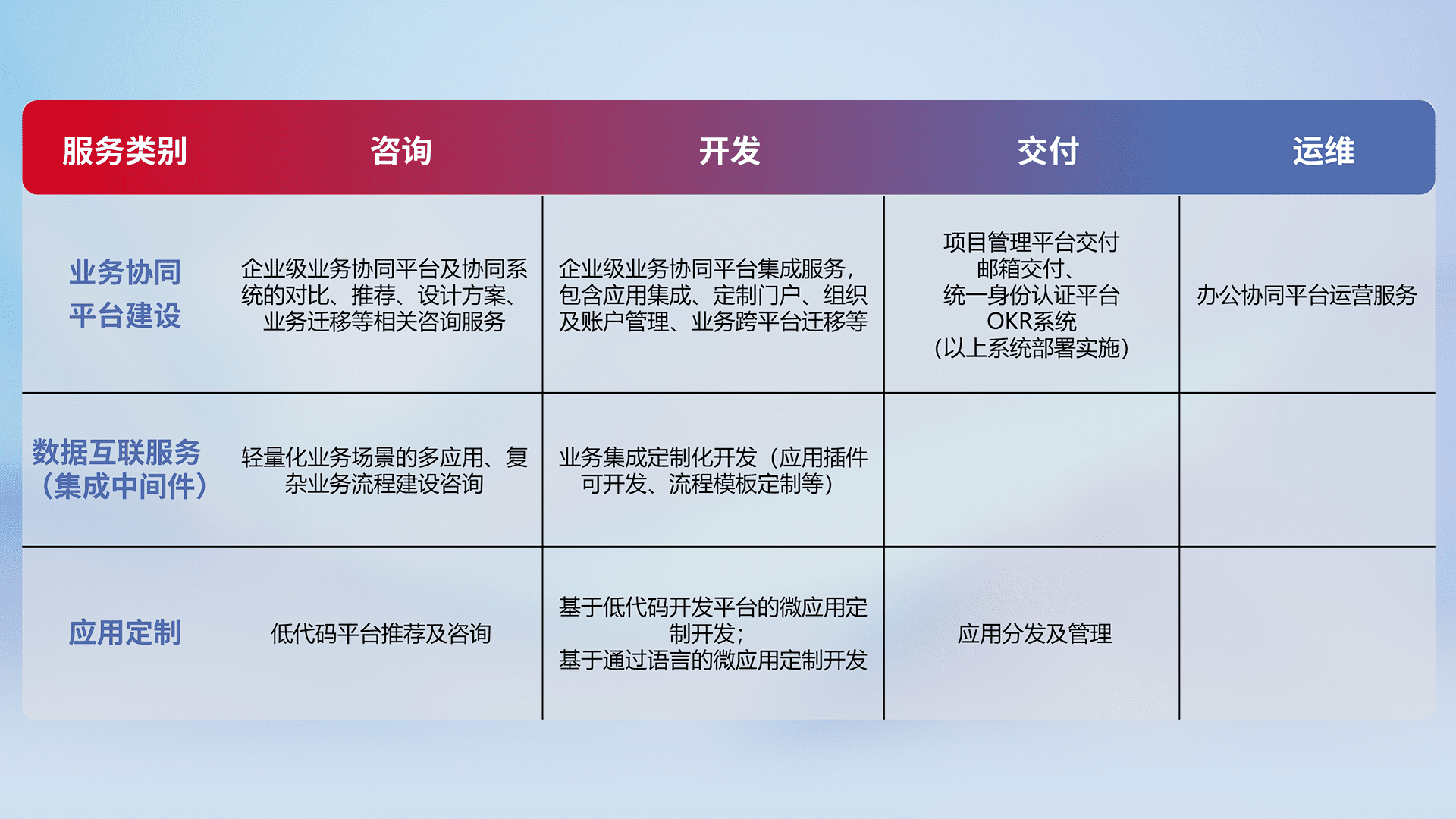 针对钉钉、、、企微、、、IDaas等平台级产品提供产品的规划、、方案、、、、交付、、定制化开发等服务,,,实现如统一协同办公、、、、智能客户服务、、混合会议管理、、、、智能数据查询、、、等业务场景,,实现数字化转型。。。。