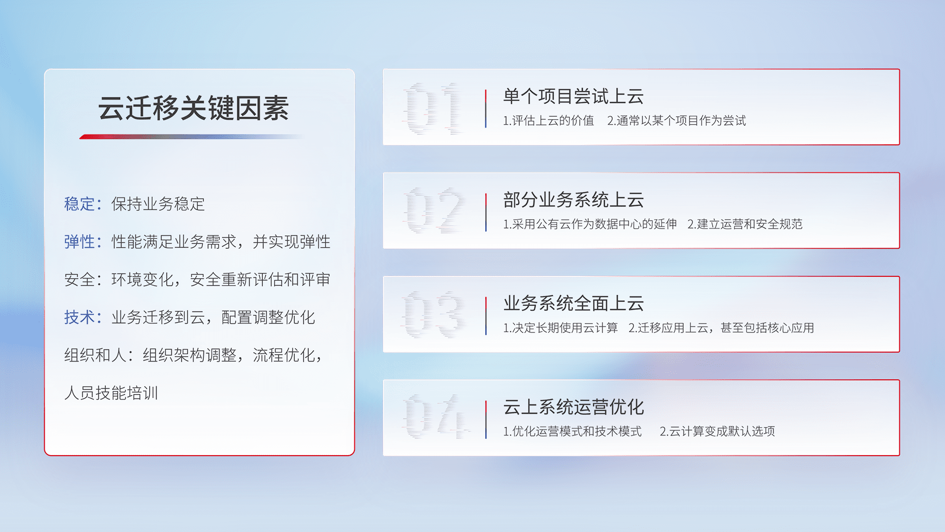 结合实际业务,,,,从规划设计、、、、云平台选型、、云原生改造、、数据迁移、、集成交付,,迁移全过程为客户识别最佳上云路径,,做好风险识别管理,,设计网络架构、、、、身份权限、、、、安全审计合规、、操作审计、、、日志审计、、监控告警策略、、、、多站点容灾设计等,,,,对云上基础设施进行整体规划,,提升IT治理水平,,以满足弹性、、、高可用、、高性能的需求。。。。